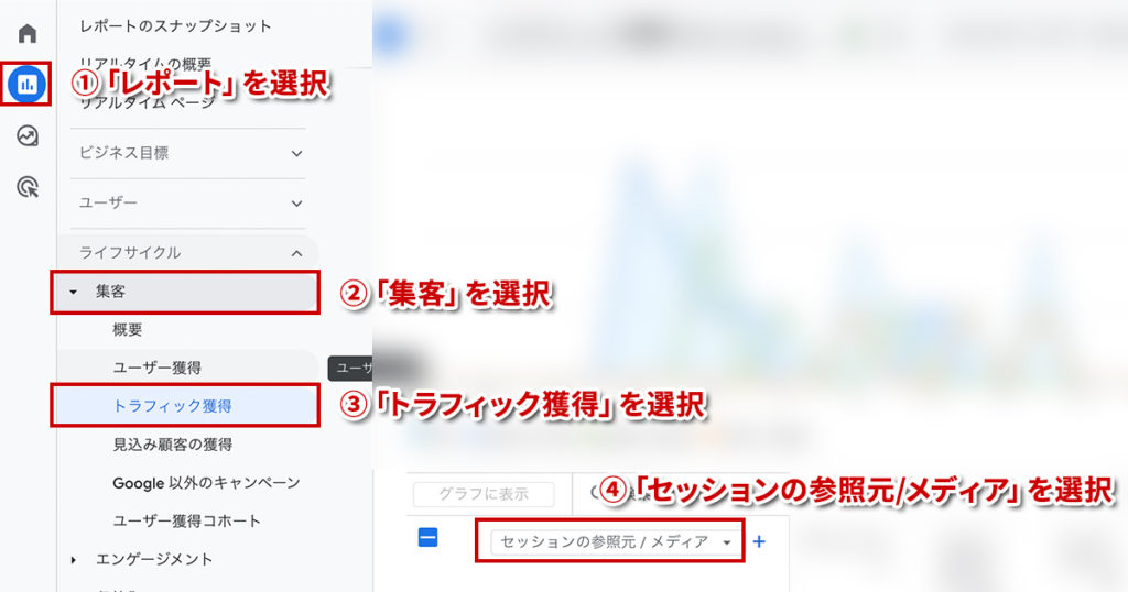 GA4では「セッションの参照元/メディア」を確認します。これを見ることで、