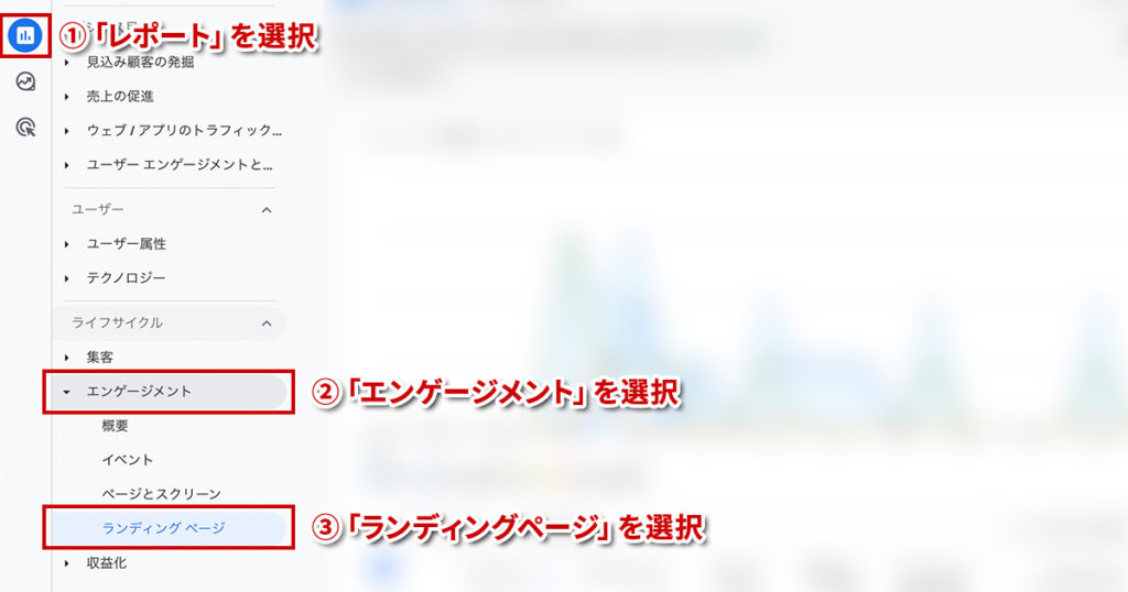 GA4の「レポート」→「エンゲージメント」→「ランディングページ」を開きます。