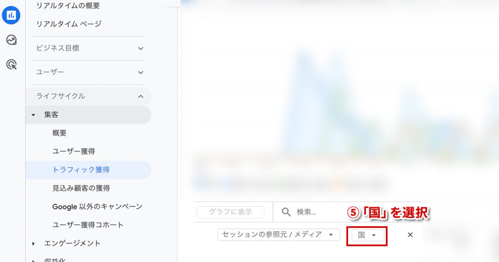 GA4の「レポート」でセカンダリディメンションに「国」を追加します。